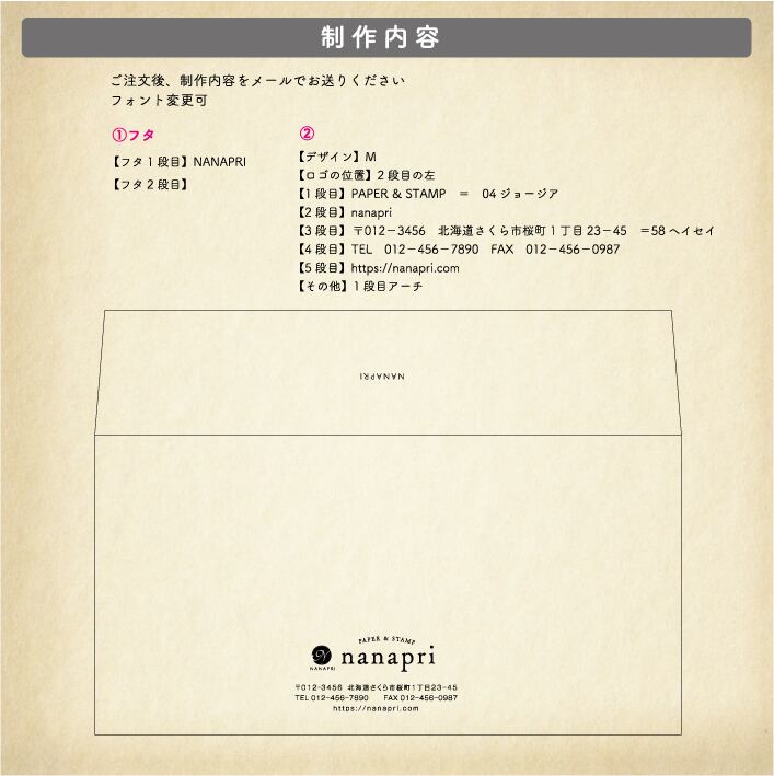 1. ご注文後、メッセージまたはメールに下記制作内容をコピー&ペーストしてお知らせください。